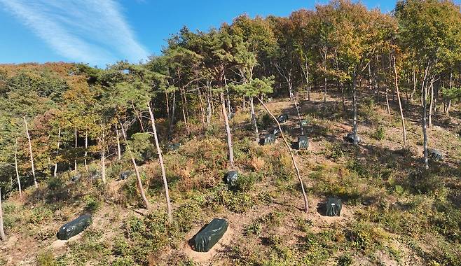 | ▲ 재선충 확산 지역마다 소나무를 잘라 독성 농약을 뿌리고 비닐로 덮어 훈증하고 있는 소나무 무덤들로 가득하다. |