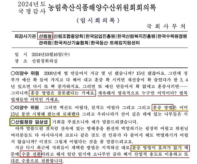 | ▲ 임상섭 산림청장이 지난 10월 산림청 국정감사에서 훈증이 효과없는 잘못임을 시인했다. 그렇다면 지금까지 그 엄청난 비용을 들여 왜 훈증을 해온 것일까? |