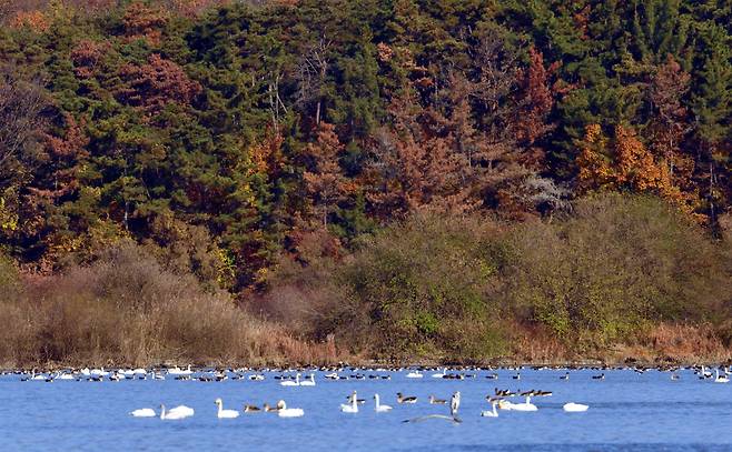 | ▲ 큰고니와 기러기들이 노니는 호수 뒤편 숲의 소나무들이 재선충으로 고사했다. |