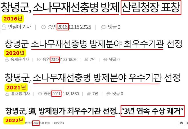 그동안 언론에 소개된 창녕군의 재선충 방제 방법들을 살펴보자. <경남도민일보>는 '창녕군 소나무재선충병 방제분야 최우수기관 선정'(2020년 11월 23일)이라는 보도에서 재선충 방제를 위한 창녕군의 노력을 이렇게 소개했다.