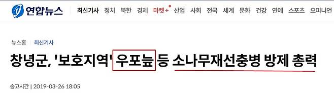 연합뉴스 역시 '창녕군, 보호지역 우포늪 등 소나무재선충병 방제 총력'(2019년 3월 26일)이란 제목의 기사를 보도했다.