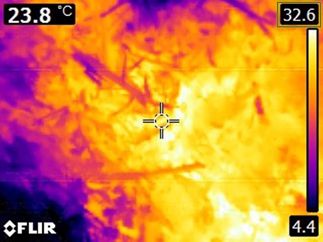 | ▲ 소나무 재선충 감염목 파쇄 현장을 열화상 카메라로 측정해보니 32.6도가 측정되었다. 소나무 파쇄는 재선충 확산 기폭제였던 것이다. |