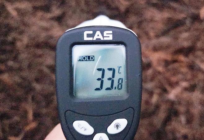 | ▲ 소나무 파쇄더미를 디지털 온도계로 측정해보니 역시 33도가 측정되었다. 소나무 파쇄는 솔수염하늘소 등이 추운 겨울을 잘 지낼 수 있도록 따듯한 침실을 만들어 준 재선충 기폭제였다. |