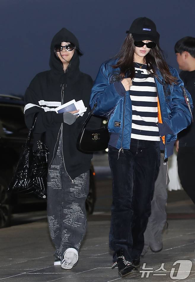 (김포공항=뉴스1) 권현진 기자 = 걸그룹 뉴진스의 하니와 다니엘(오른쪽)이 일본 도쿄 마쿠하리 멧세에서 열리는 '카운트다운 재팬 24/25(COUNTDOWN JAPAN 24/25)’ 일정을 위해 29일 오전 김포국제공항을 통해 일본 도쿄로 출국하고 있다. 2024.11.29/뉴스1