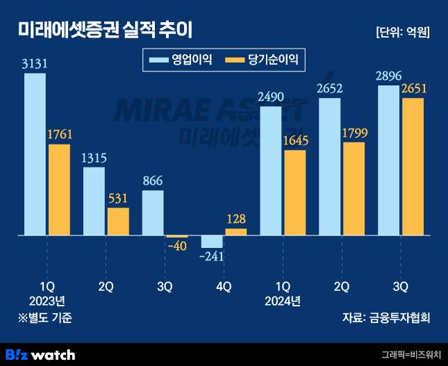 이 같은 경영체제가 꾸려지고 나서 받은 첫해 실적은 견조하는 평가를 받는다. 미래에셋증권의 별도 기준 3분기 누적 영업이익은 8038억원으로 전년동기대비 51% 늘었다. 같은 기간 순이익도 6095억원으로 171% 성장했다.