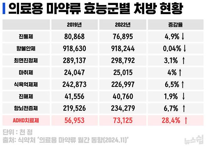 현재 식약처가 관리하고 있는 의료용 마약류는 효능별로 진통제, 항불안제, 최면진정제, 마취제, 식욕억제제, 진해제, 항뇌전증제, ADHD 치료제로 분류된다. ADHD 치료제의 비중은 이 중 가장 적지만 처방량 증가세는 가장 뚜렷하다. 2022년 ADHD 치료제는 7,312만 정이 처방됐는데 3년 전과 비교해 28.4% 증가했다. 같은 기간 처방량이 증가한 최면진정제(3.1%), 마취제(4%), 항뇌전증제(6.7%)와 비교해 봐도 증가세가 단연 높다.