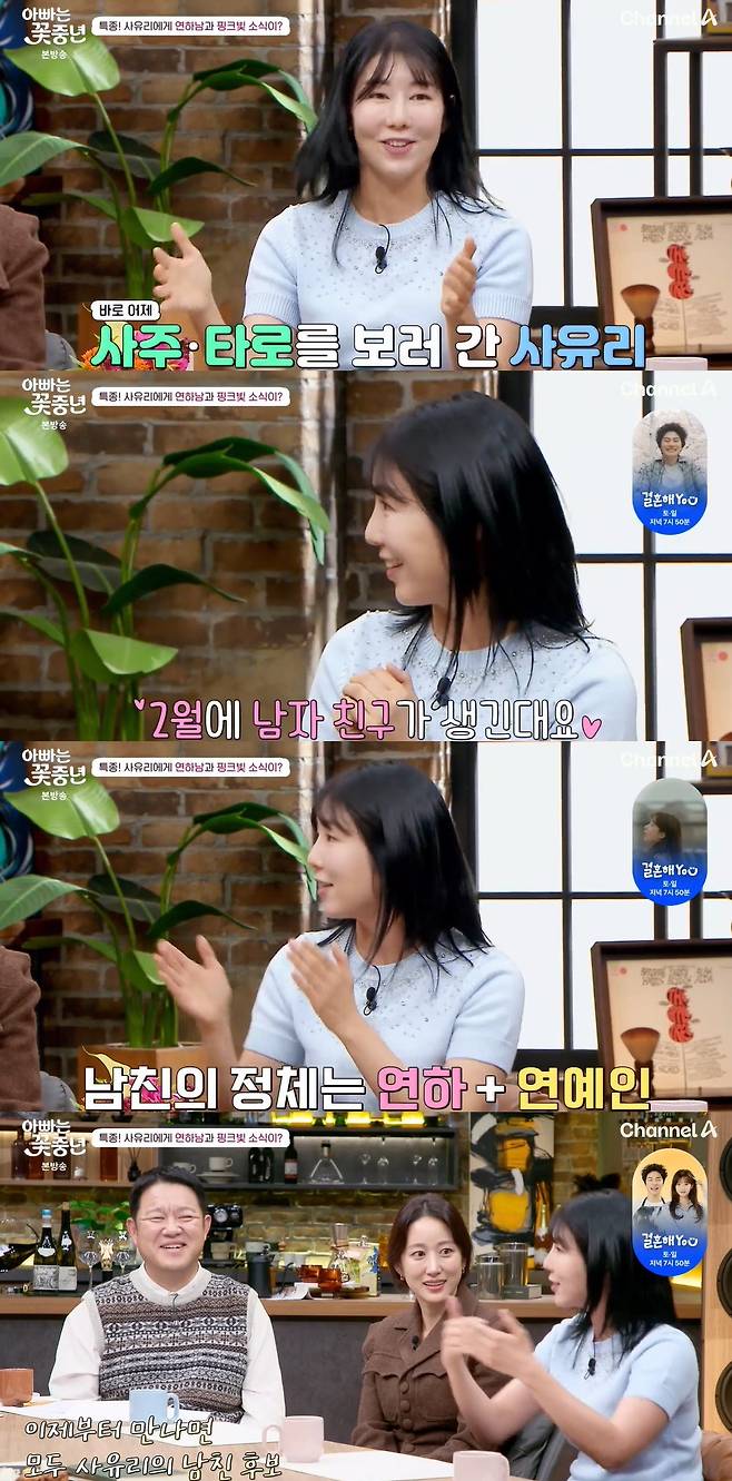 스튜디오에서 사유리는 “어제 사주를 봤는데, 2월에 남자친구가 생긴다더라. 연하의 연예인이라고 한다. 이제부터 촬영에서 만나는 사람이 사귈 수 있다고 생각하고 지켜보고 있다"며 설렘을 표했다.