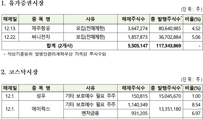 시장별로 코스피에선 2개 사 550만주, 코스닥 시장에선 50개 사 2억6천779만주가 의무 보유 등록에서 해제됩니다.
