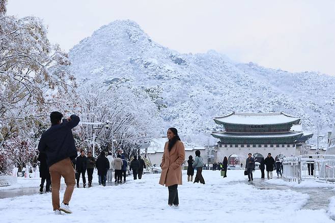 [서울 등 중부 지역에 많은 눈이 내린 27일 오전 눈 쌓인 서울 광화문 광장에서 외국인 관광객이 사진을 찍고 있다 (사진=연합뉴스)]