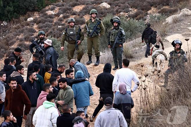 (나블루스 AFP=뉴스1) 우동명 기자 = 28일 (현지시간) 요르단 강 서안 지구 나블루스에서 이스라엘 군이 피난하는 팔레스타인 농민들을 감시하고 있다. 2024.11.29