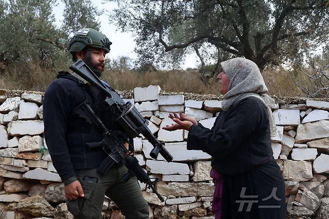 (나블루스 AFP=뉴스1) 우동명 기자 = 28일 (현지시간) 요르단 강 서안 지구 나블루스에서 이스라엘 군이 피난하는 팔레스타인 농민과 얘기를 하고 있다. 2024.11.29