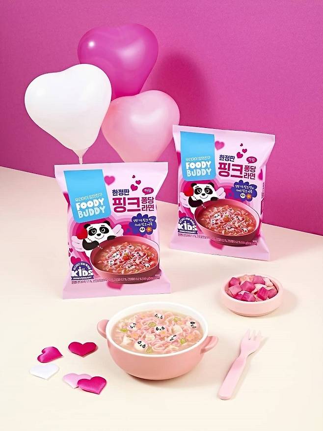 하림은 푸디버디 출시 1년을 기념해 리미티드 에디션 ‘핑크퐁당라면’을 출시했다. 이번 한정판 신제품은 지난 8월 스타필드 하남에서 진행한 푸디버디 팝업스토어 행사에서 아이들에게 가장 많은 선택을 받았던 ‘핑크 컬러면’으로 만들었다.
