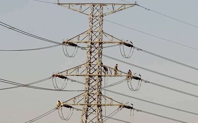 | ▲ [26일 화] 북한 군인들이 개성공단 전력 공급을 위해 남측이 지어준 송전탑에 올라 송전선을 자르고 있다. 철탑인 송전탑은 북한이 지난달 15일 폭파한 군사분계선 북쪽 지점부터 개성공단까지 연결되는 경의선 도로에 수백 미터 간격으로 지어져 있으며 남측 문산에서 북한 평화변전소로 이어지는 총 48기의 철탑 가운데 15기가 북측에 있다. |