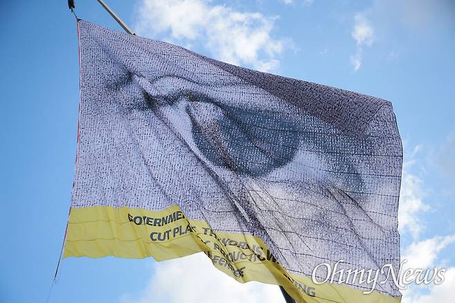 | ▲ [25일 월] 국제플라스틱협약 5차 정부간협상위원회가 부산 벡스코에서 열린 가운데 그린피스가 수영만요트경기장에 가로 30m, 세로 24m의 초대형 '감시의 눈' 깃발을 걸고 플라스틱 절감 대책을 촉구하고 있다. 이 깃발은 스위스 예술가 댄 아처와 협업한 것으로 '전 세계가 지켜보고 있다'는 뜻을 담아 전 세계 시민 6472명의 초상을 이용해 만들었다. |