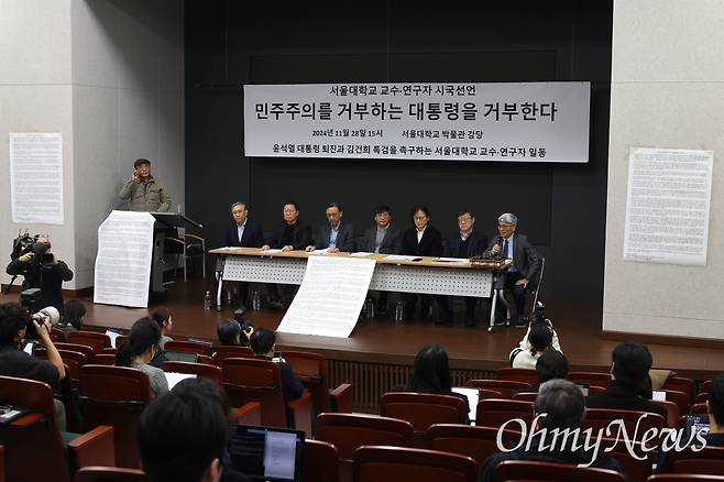 | ▲ 윤석열 대통령 퇴진과 김건희 특검을 촉구하는 서울대학교 교수-연구자들이 28일 오후 서울 관악구 서울대 박물관 강당에서 ‘민주주의를 거부하는 대통령을 거부한다’는 시국선언을 발표하고 있다. 이날 시국선언에는 서울대의 교수·연구자 525명이 참여해 최근 이어지는 대학가 시국선언 중 단일대학 기준 최대 규모다. |