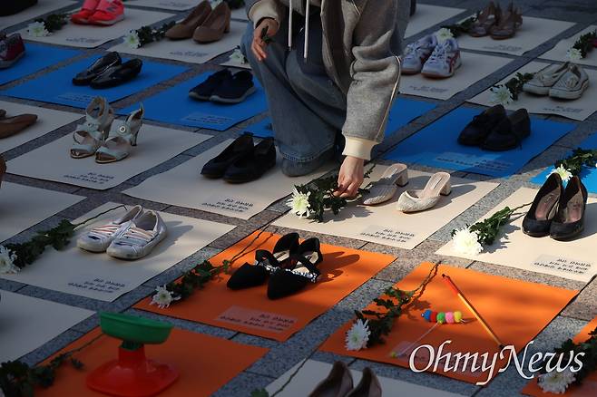 | ▲ [25일 월] 세계여성폭력추방주간을 맞아 서울 종로구 보신각 앞에서 한국여성의전화 주최로 '여성 살해 규탄 퍼포먼스 - 192켤레의 멈춘 신발'을 하고 있다. 여성의전화는 2009년부터 언론보도를 집계한 결과 지난 15년간 친밀한 관계의 남성 파트너에 의해 살해된 여성과 주변인은 최소 1672명, 2023년 한 해 동안 최소 192명으로 나타났다고 밝혔다. |