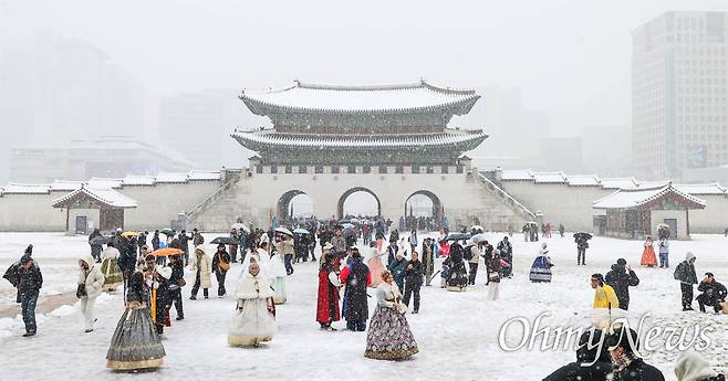 | ▲ [27일 수] 서울 경복궁에서 관광객들이 폭설 내리는 고궁을 관람하고 있다. 전날 밤부터 서울 지역에 내리기 시작한 눈이 20㎝ 넘게 쌓여 1907년 근대적인 기상관측을 시작한 이래 117년 만에 11월 들어 가장 많은 눈이 쌓인 것으로 기록됐다. 이날 오전 서울 전역에 대설주의보가 내려졌고 눈이 집중된 동북부 지역엔 대설경보가 발효됐다. |