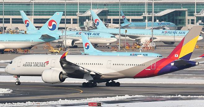 | ▲ [28일 목] 인천 영종도 인천국제공항 활주로와 주기장에 대한항공과 아시아나항공 여객기가 보이고 있다. 대한항공과 아시아나항공 간 기업결합의 사실상 마지막 관문인 유럽연합 집행위원회의 최종 승인이 이날 완료됨에 따라 2020년 11월 시작된 기업결합 절차가 다음 달 대한항공의 아시아나항공 신주 인수가 끝나면 마무리될 전망이다 |