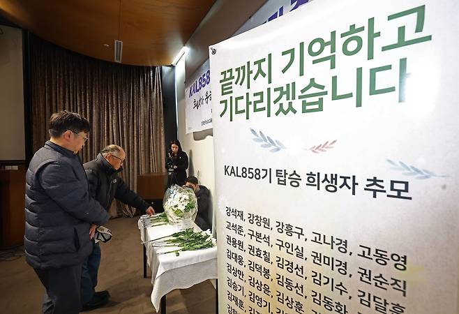 | ▲ [29일 금] 서울 중구 프란치스코교육회관에서 열린 대한항공KAL858기탑승희생자유족회 주최 37주기 추모제에서 유족 등 참석자들이 헌화하고 있다. 1987년 11월 29일 이라크 바그다드를 출발해 서울로 향하던 대한항공 보잉707(KE858) 여객기가 인도양 버마(현 미얀마) 상공에서 폭파돼 실종된 사건으로 승객과 승무원 119명이 전원 사망했다. |