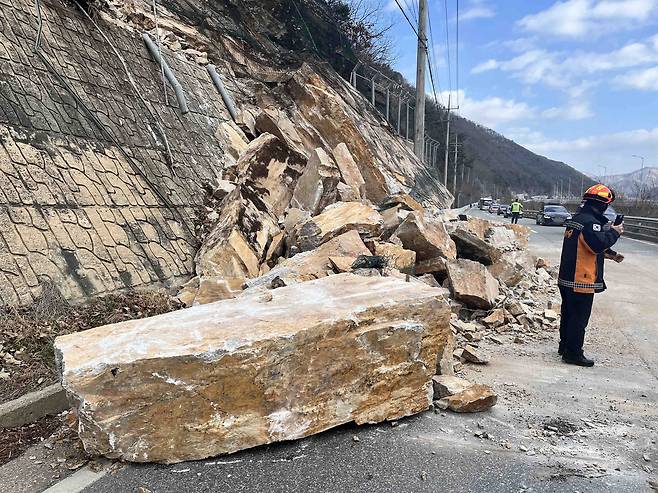 | ▲ [29일 금] 강원도 춘천시 서면 덕두원리 국도 46호선 등선폭포 인근에서 낙석이 발생해 도로 당국이 도로 통행을 제한하고 복구 작업을 진행하고 있다. 춘천시는 안전안내문자를 통해 팔미교차로에서 우회 운행을 안내하고 홍천국토관리사무소는 최근 폭설로 인해 지반이 약해져 낙석이 발생한 것으로 보고 사고 원인을 조사 중이다. |