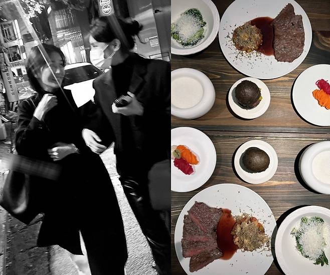 사진 속 스테이크를 메인으로 하는 정갈한 식사가 눈길을 끌며, 2인분이 준비되어 있어 두 사람이 함께 시간을 보낸 것으로 보인다.