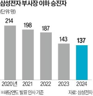 삼성전자는 29일 실시한 내년 정기 임원인사에서 부사장 35명, 상무 92명, 마스터 10명 등 총 137명을 승진시켰다. 지난해 총 143명(부사장 51명, 상무 77명, 펠로 1명, 마스터 14명)이 승진한 것과 비교하면 규모가 4% 줄었다. 부사장 승진자는 전년 대비 31% 줄어든 반면 상무 승진자는 19% 늘었다. 대내외 불확실한 경영 상황에 대비해 전반적으로 임원 조직을 ‘슬림화’하면서도 젊은 인재 육성에 힘을 실었다는 평가다.