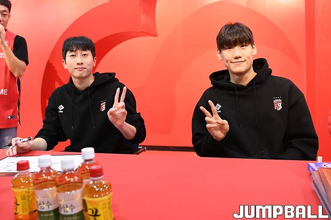 [점프볼=안양/유용우 기자] 29일 안양 정관장 아레나에서 열린 2024-2025 KCC 프로농구 안양 정관장과 부산 KCC의 경기, 정관장 신인 소준혁과 박정웅이 사인회로 팬들과의 만남을 가졌다.
