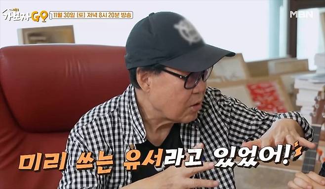 [TV리포트=홍진혁 기자] 가수 조영남이 미리 작성한 유서의 내용을 공개했다. 29일 선공개된 MBN '가보자Go'에서는 조영남이 MC 홍현희와 안정환과 담소를 나눴다.