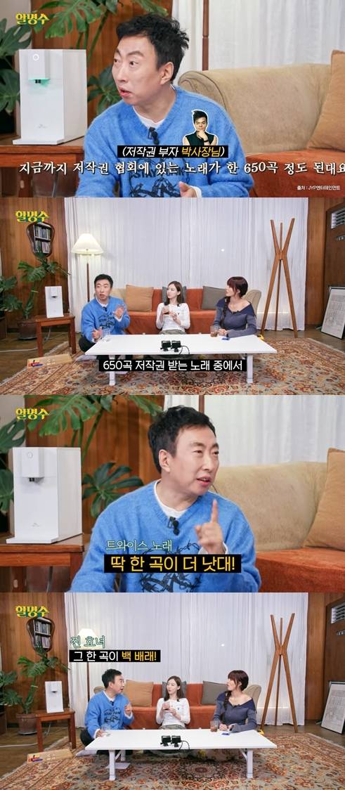 박명수는 "박진영이 그러던데 지금까지 저작권협회 등록된 노래가 한 650곡 된다더라"라고 운을 뗐다. 이어 "근데 650곡 저작권 받는 노래 중에서 트와이스 'WHAT IS LOVE' 한 곡이 다른 곡의 100배라더라"고 말했다.