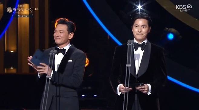 지난 29일 서울 영등포구 여의도 KBS홀에서 제 45회 청룡영화상이 개최된 가운데 정우성은 영화 '서울의 봄'으로 호흡을 맞춘 황정민과 함께 시상자로 무대에 올랐다.
