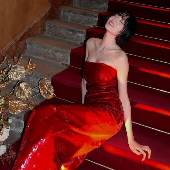 반짝이는 시퀸 장식이 촘촘하게 엮인 레드 드레스로 연말의 화려한 분위기를 가득 표현한 나나. 파티의 주인공이 되고 싶다면 그녀처럼 과감한 레드 룩을 추천합니다!