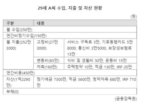 29세 A씨 월 수입은 250만원이다. 연간 비정기 수입으로는 150만원이 들어온다. 월 지출은 252만3000원이다. 고정비는 27만3000원이다. 서비스 구독료(3만원), 기후동행카드(5만8000원), 통신비(3만5000원), 보장성보험료(15만원) 등이다. 변동비로는 식비·생활비(50만원), 운동비(15만원) 등을 합쳐 65만원이 든다. 저축은 주택청약(10만원), 적금(130만원), 개인형퇴직연금(IRP·20만원) 등 160만원씩 하고 있다. 연간비용은 450만원이다.