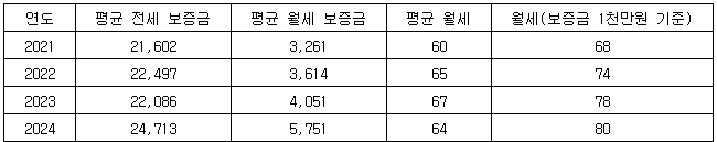 [표] 2021∼2024년 평균 전월세 (단위: 만원)