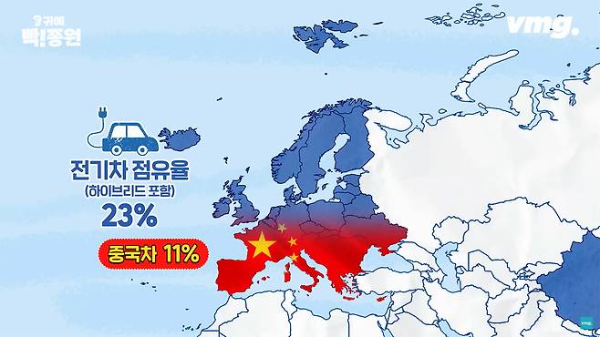 전 세계적으로 지난해 새로 팔린 전기차는 1천400만 대로 집계됩니다. 이들의 95%를 소비한 곳은 북미와 유럽, 중국입니다. 이 중 중국 전기차는 북미를 빼고는 유럽과 중국 시장을 장악하고 있습니다. 유럽만 보더라도 전기차 비중이 20%가 조금 넘는데, 이 중 11%가 중국산으로 집계되고 있습니다.
