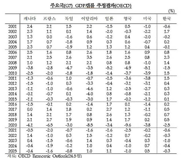 OECD의 24년간(2001∼2024년) 추정치 통계에서 한국의 잠재성장률이 G7 국가를 밑도는 경우는 처음이었습니다.