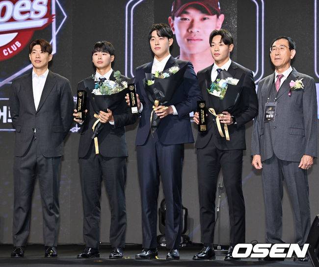 퓨처스리그 시상식에서 고양 히어로즈 퓨처스리그 시상식 이승원 김동규 심휘윤이 키움 송성문과 포토타임을 갖고 있다. 2024.12.01 / rumi@osen.co.kr