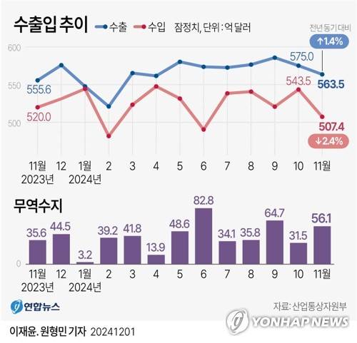 (서울=연합뉴스) 원형민 기자 = 1일 산업통상자원부가 발표한 11월 수출입 동향에 따르면 올해 11월 수출액은 563억5천만달러로 지난해 같은 달보다 1.4% 증가했다.