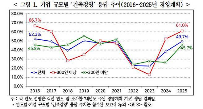 300인 이상 기업의 긴축 경영 응답은 2016년 조사 이후 9년 만에 가장 높았습니다.