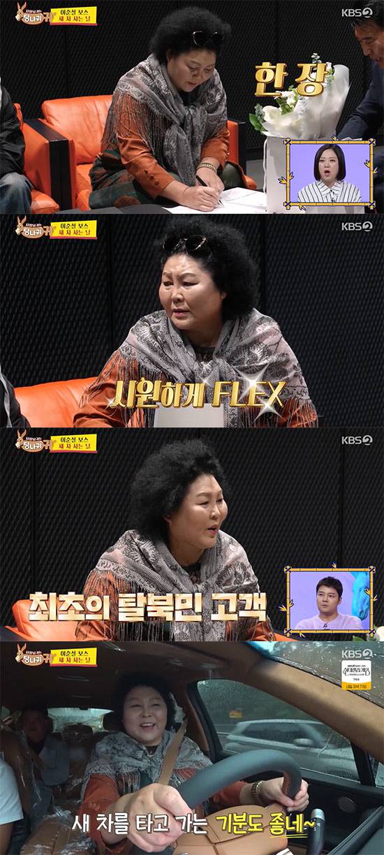 1일 방송된 KBS 2TV '사장님 귀는 당나귀 귀'에서는 탈북민 보스 이순실이 1억 원의 새 차 플렉스를 자랑했다.