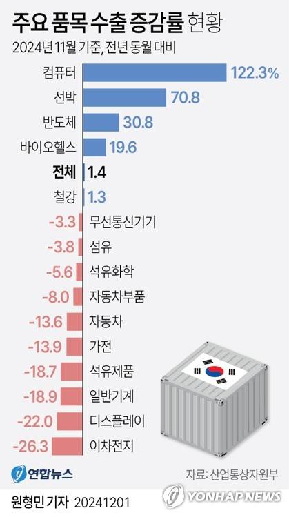(서울=연합뉴스) 원형민 기자 = 한국의 11월 수출이 1.4% 증가하면서 수출이 14개월 연속 증가세를 유지했다.