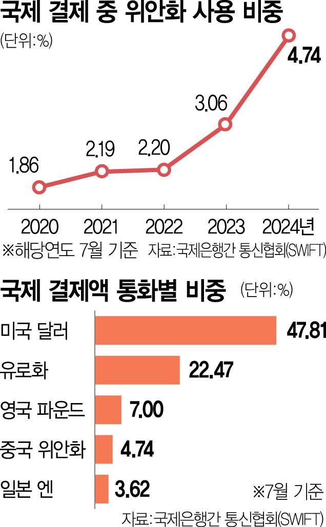 국제통화기금(IMF)에 따르면 전 세계 중앙은행의 외환보유액 중 달러화 비중은 2016년 2분기 65.2%였지만 올해 2분기 58.2%로 줄었다. 반면 중국 위안화는 비교 가능한 2016년 4분기 1.08%에 불과했지만 올해 2분기 2.14%로 2배 증가했다. 국제은행간통신협회(SWIFT)에 따르면 국제결제 시장에서의 위안화 사용 비중도 올 7월 4.74%로 1년새 1.65%포인트 늘어나며 역대 최고를 기록했다. 2020년 9월까지만 해도 1.97%로 2%가 채 안 됐지만 4년이 안 돼 2배 이상 급증한 셈이다. 지난해 11월에는 일본 엔화를 제치고 4위로 뛰어오르는 등 급속도로 세(勢)를 불리고 있다.