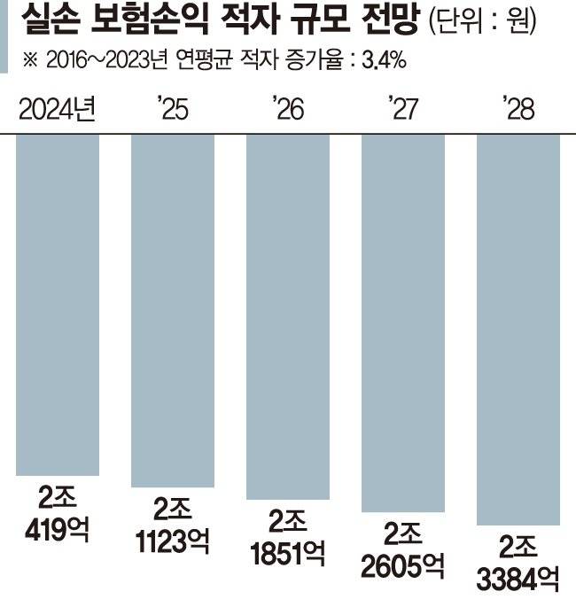 지금과 같은 흐름이라면 올해부터 오는 2028년까지 5년간 누적 보험손익 적자가 약 11조원에 이를 전망이다.