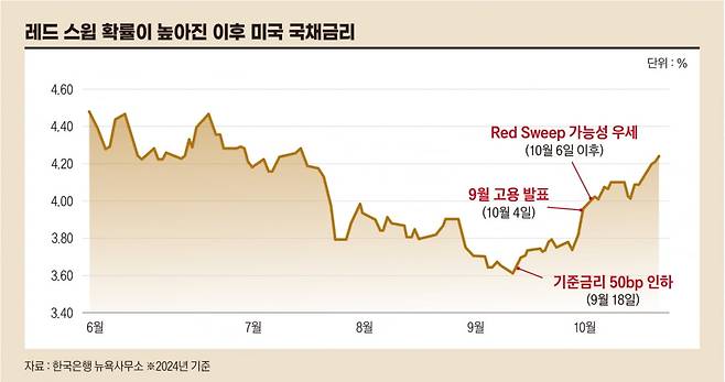 상황은 안 좋다. 47대 미국 대통령선거에서 트럼프 후보의 압승으로 끝나면서 고금리·강달러로 엔화로 미국 국채에 투자한 것이 직격탄을 맞고 있기 때문이다. 내년 1월 20일에 출범하는 트럼프 정부는 재정수입 면에서 소득세 폐지, 법인세 감면 등 감세를 추진할 예정이다. 반면 재정지출 면에서는 뉴딜 정책을 구상하고 있어 재정적자가 크게 확대될 것으로 예상된다.