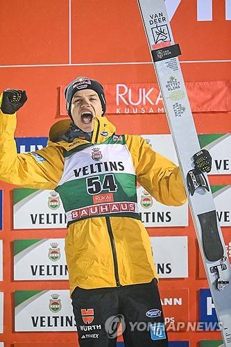 epa11751909 First placed Andreas Wellinger of Germany celebrates on the podium after the Men Large Hill Individual competition at the FIS Ski Jumping World Cup in Ruka, Finland, 01 December 2024. EPA/Kimmo Brandt