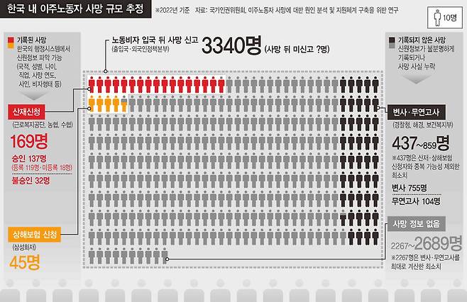 연구가 모수로 삼은 출입국본부가 집계한 사망자 3340명은 2022년 노동비자(무비자 포함)로 한국에 체류하다가 숨져 사망 사실이 신고·확인된 외국인 수다. 사망 연도와 국적, 성별, 대략적인 비자 내용, 대부분 ‘기타’로 분류된 간단한 사인만 담긴 자료라, 사망자가 누구이며 언제, 어디서, 어떻게 죽음에 이르렀는지에 관한 정보는 전혀 없다.