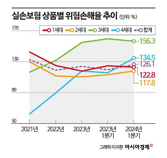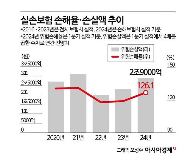 이런 상황에서 실손보험의 손해율과 손실액은 최근 꾸준히 상승하는 추세다. 위험손해율은 2022년 117.2%, 2023년 118.3%, 올해 1분기엔 126.1%로 뛰어올랐다. 위험손해율은 보험사가 보험료로 받은 돈에서 보험금으로 내준 돈의 비율이다. 위험손실액은 2022년 2조원에서 2023년 2조3000억원으로 증가했고 올해는 2조9000억원으로 늘어날 전망이다. 위험손실액은 받은 보험료를 초과해 지급한 보험금이다. 실손보험 적자가 쌓이면 보험사는 보험료를 올리고 이는 선량한 보험 가입자의 부담을 키우는 악순환으로 작용한다.