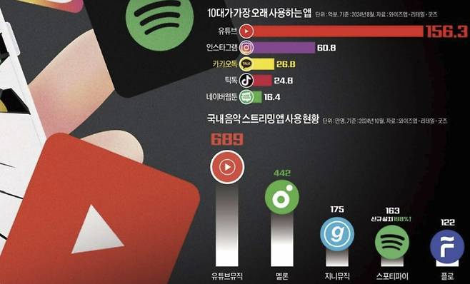 올해 10월 국내 안드로이드 이용자들이 가장 많이 찾은 음악 앱은 689만명의 유튜브 뮤직이었다. 2위 멜론은 442만명으로 큰 차이를 보였고, 3위 지니뮤직(175만명)은 조만간 스포티파이(163만명)에 밀릴 위기에 직면했다.