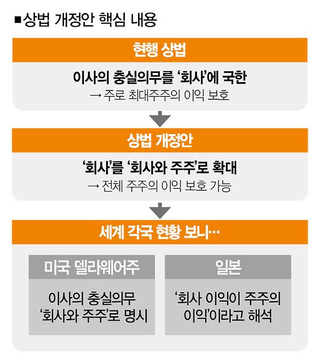 개정안의 핵심은 "이사는 법령과 정관의 규정에 따라 회사를 위해 그 직무를 충실하게 수행해야 한다(제382조의3)"고 돼 있는 '이사의 충실의무' 대상을 '회사'에서 '회사 및 주주'로 바꾸는 겁니다.