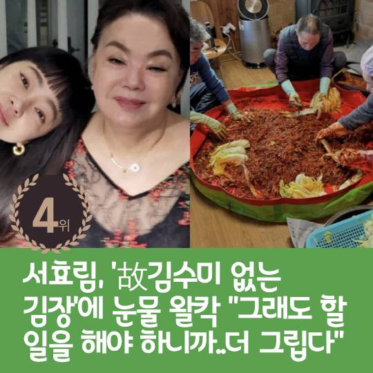 4위 : 서효림, '故김수미 없는 김장'에 눈물 왈칵 "그래도 할 일을 해야 하니까..더 그립다"