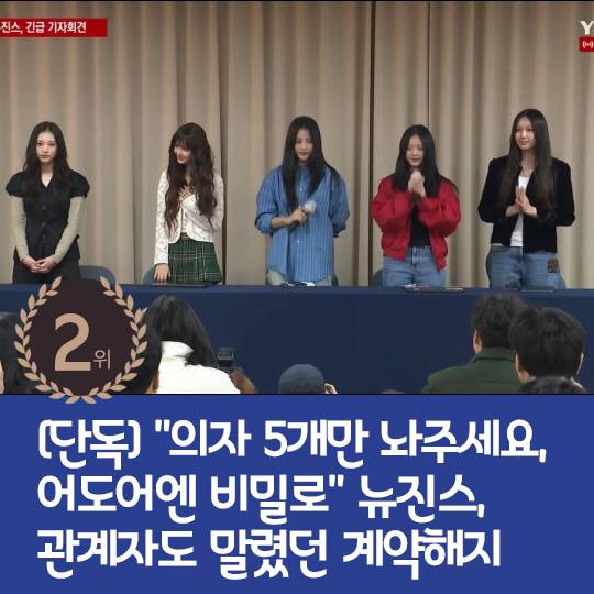 2위 : [단독] "의자 5개만 놔주세요" 뉴진스, 관계자도 말렸던 계약해지 기자회견